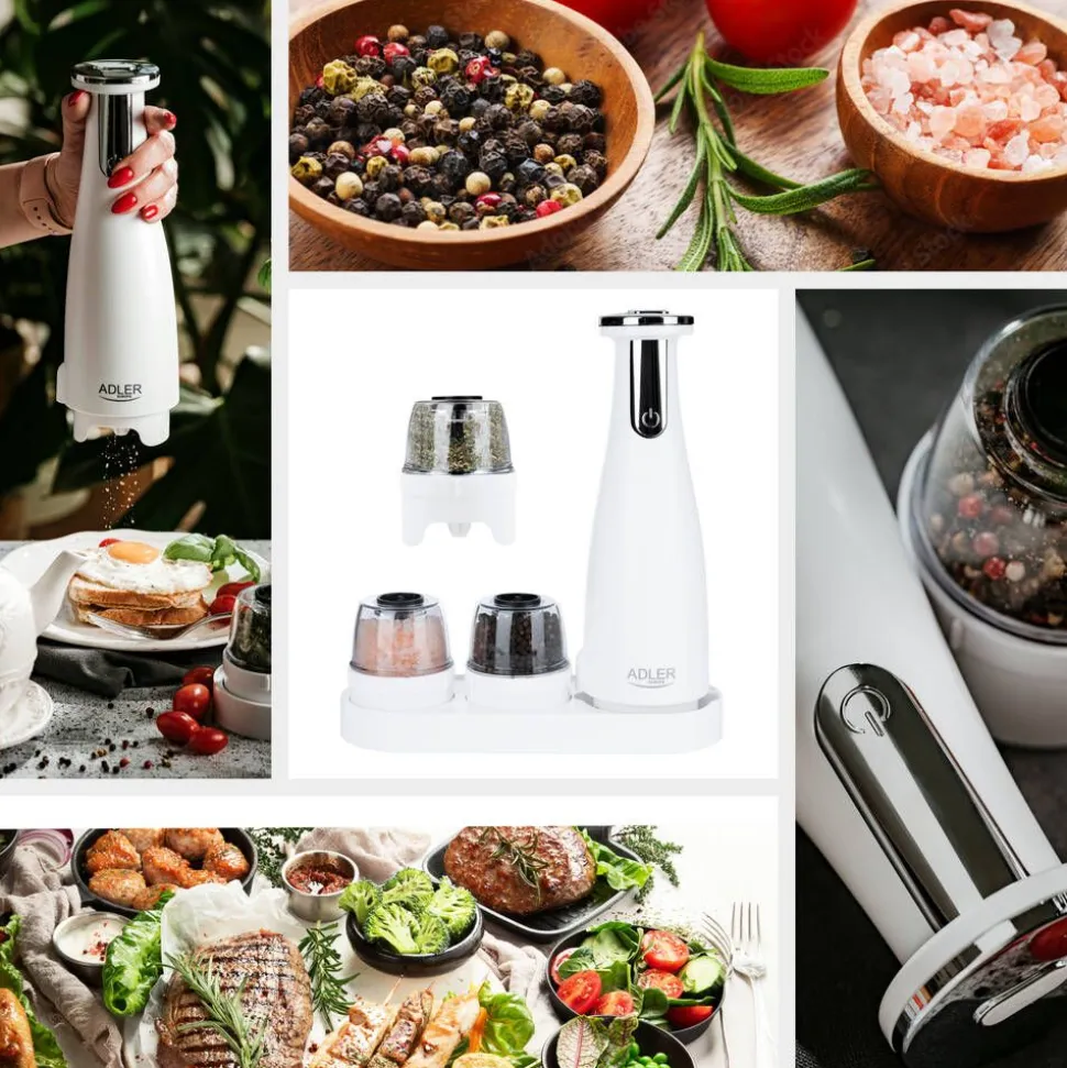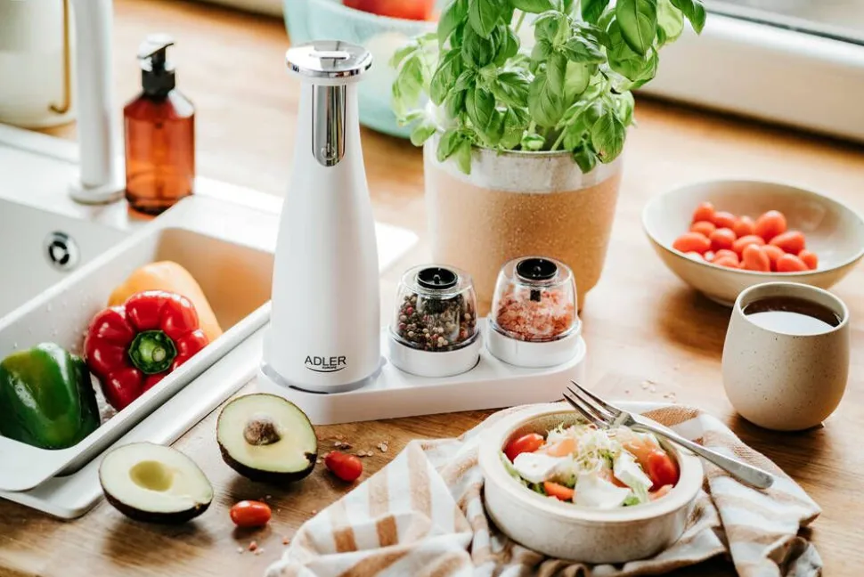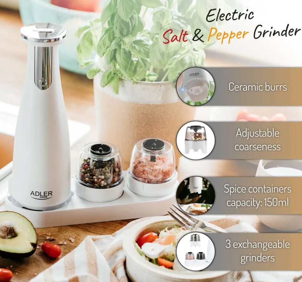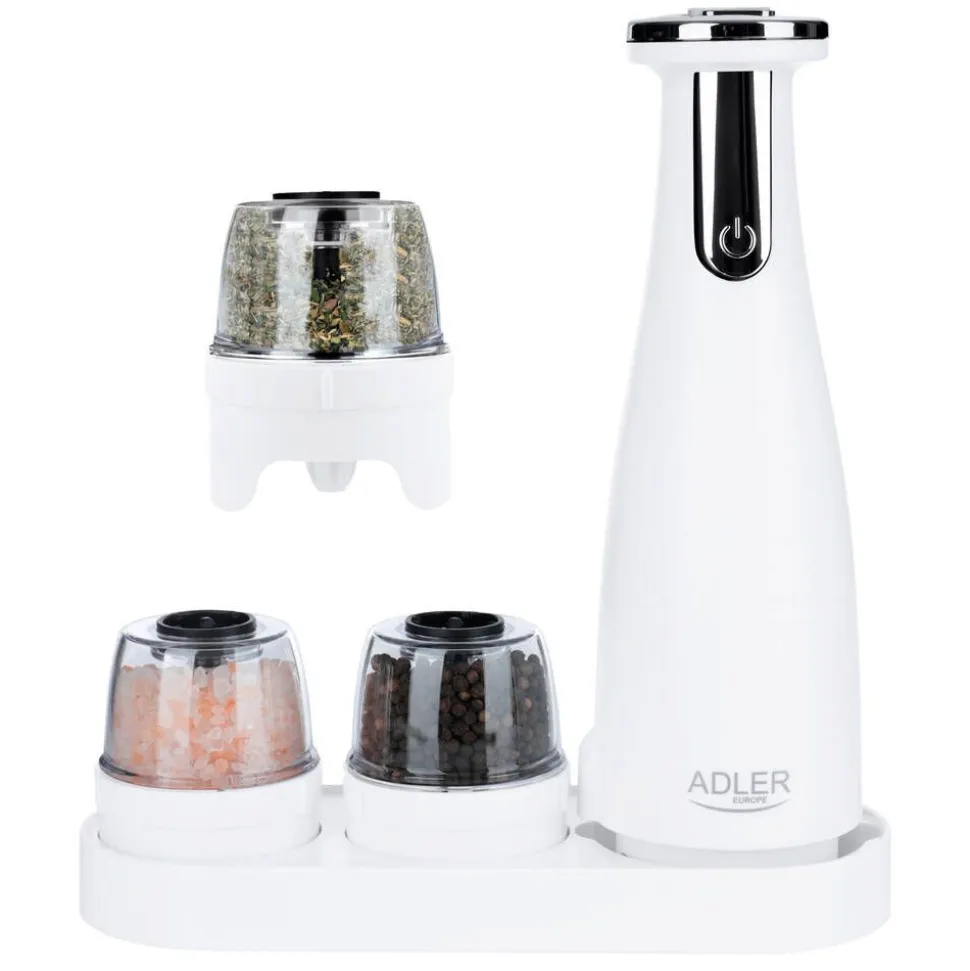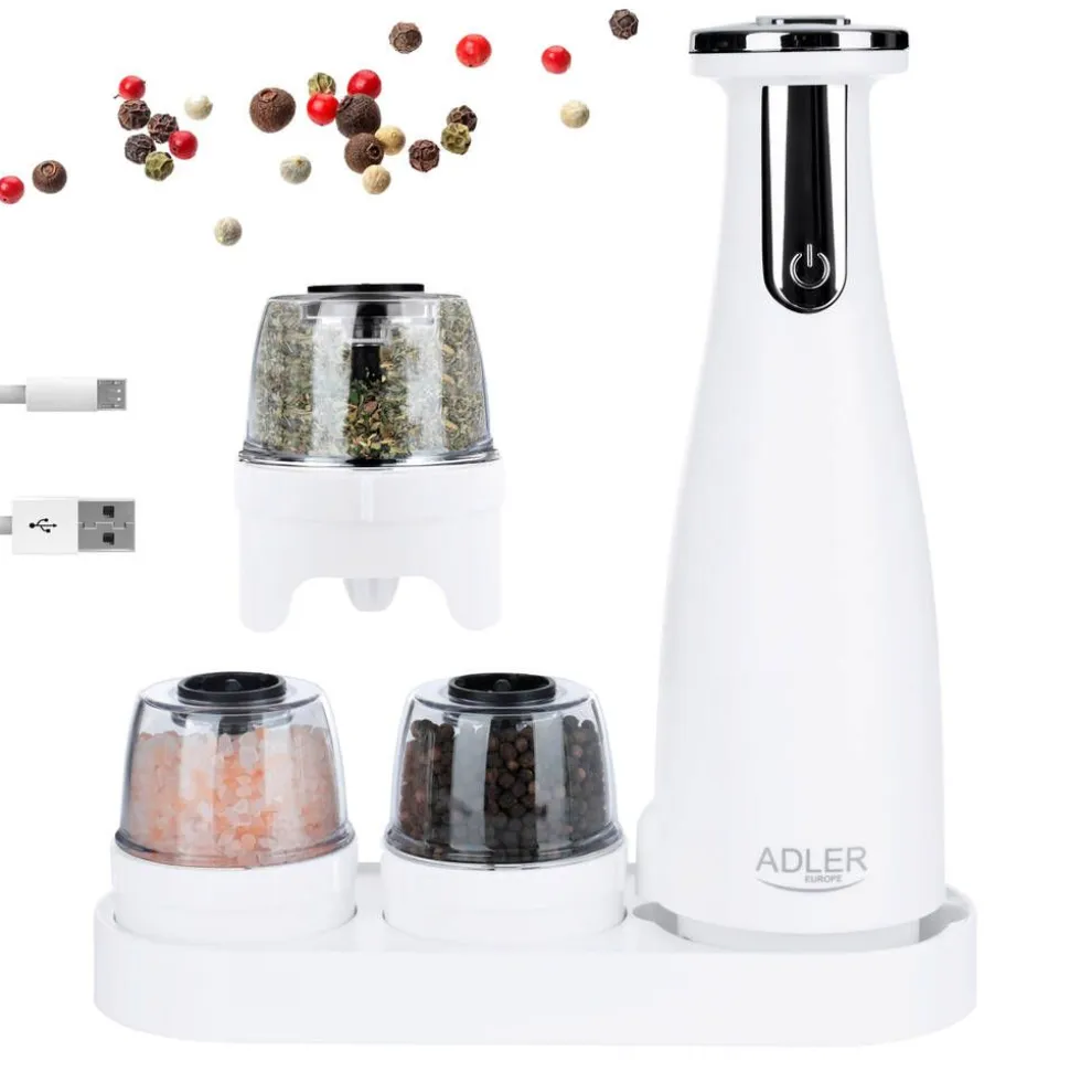 | Yhden myyntipakkauksen sisältö:Pohja, 3 vaihdettavaa myllyä, alusta, USB-latauskaapeli |