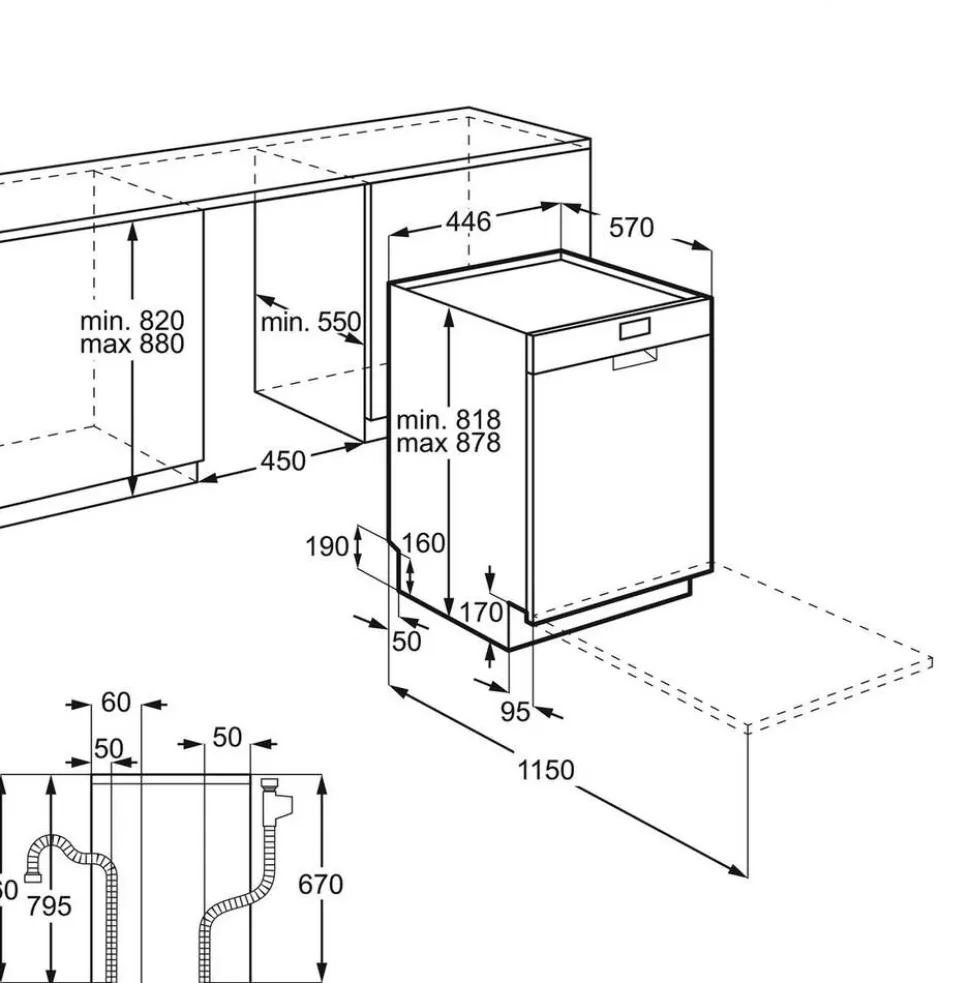 | Mitat:KxLxS (mm) 818-878 x 446 x 575. Paino 32 kg. Vedenottoletkun pituus: 150 cm. Poistoletkun pituus: 150 cm. Virtajohdon pituus: 150 cm. |