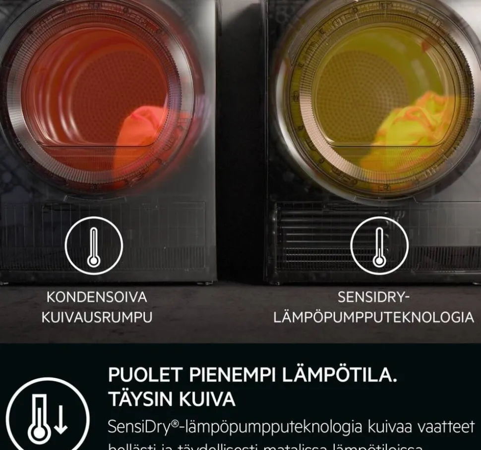 | reciseDry-tekniikka optimoi kuivausohjelman pyykkimäärän mukaan. Tämä ei vain säästä energiaa, vaan myös aikaa – ja varmistaa, että vaatteet pysyvät pehmeinä ja näyttävät hyvältä pitkään. SensiDry® puolestaan kuivattaa vaatteet matalassa lämpötilassa, suojaten niitä liialliselta lämmöltä ja pidentäen näin niiden käyttöikää. |