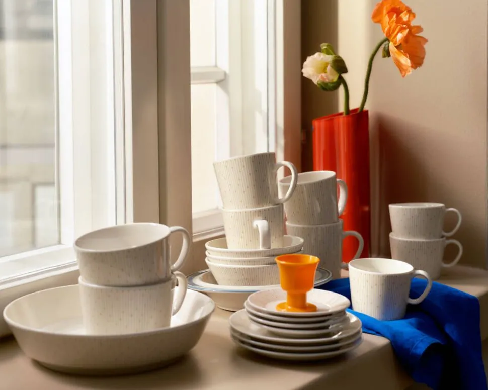 | Mainio Sarastus on Arabian uusi pinottava astiasarja, jossa voi myös tarjoilla, valmistaa ja säilyttää ruokaa. Pieneen tilaan pinoutuvan ja monikäyttöisen astiaston muoto on täysin uusi, Mainio. Sarastus-kuvion inspiraatio on Raija Uosikkisen vuonna 1965 suunnittelema Ivalo-koristeesta. Astiasto koostuu lautasista, kupeista ja kulhoista, ja sen kaikki osat pinoutuvat keskenään – lautaset sopivat kansiksi ja kulhot sekä kupit säilytysastioiksi. |