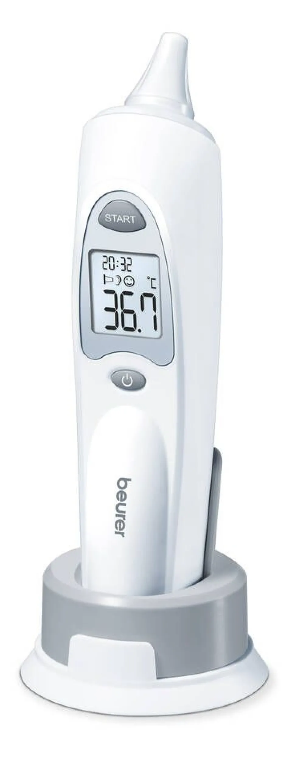 | Selkeän numeerisen näytön lisäksi lämpötila ilmaistaan myös hymiön avulla: (1) Jos mitattu lämpötila on alle 38 °C näytölle ilmestyy naurava hymiö ja kuuluu lyhyt merkkiääni. (2) Jos mitattu lämpötila on 37,5–37,9 °C, kuuluu lisäksi kaksi lyhyttä merkkiääntä (osoitus kohonneesta lämpötilasta). (3) Jos mitattu lämpötila on 38 °C tai korkeampi, näytölle ilmestyy surullinen hymiö ja mittarista kuuluu peräkkäin lyhyt, pitkä ja kolme lyhyttä merkkiääntä |
