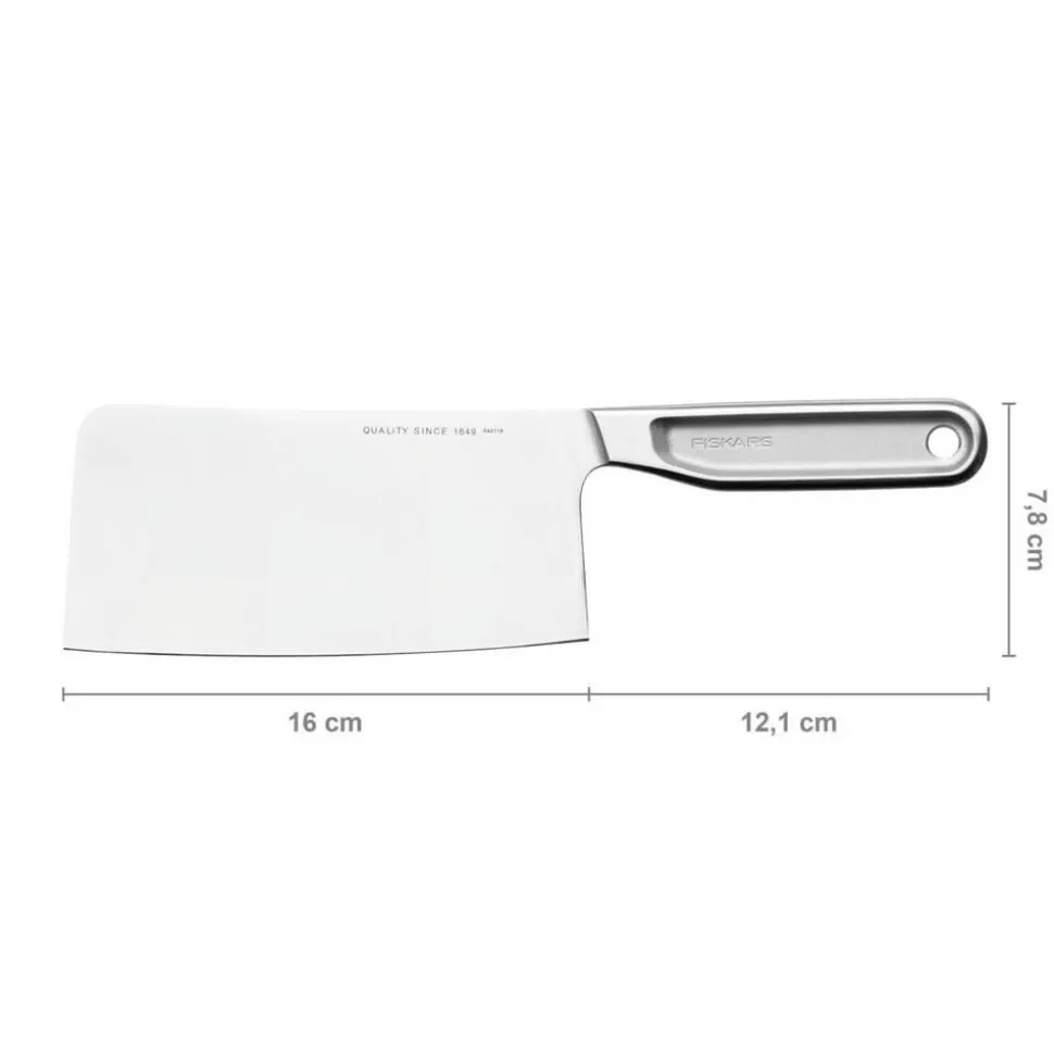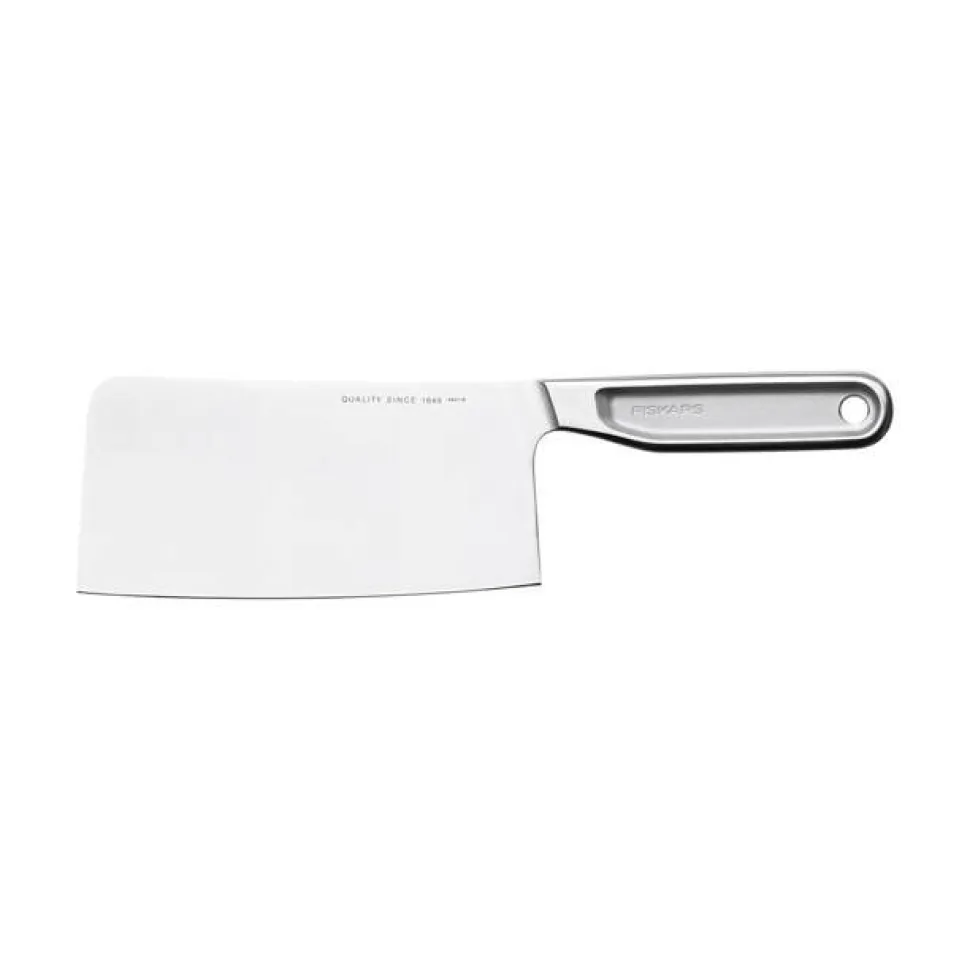 | Leveä terä soveltuu esimerkiksi lihan, kalan, kovien vihannesten ja luiden pilkkomiseen sekä leikkaamiseen |