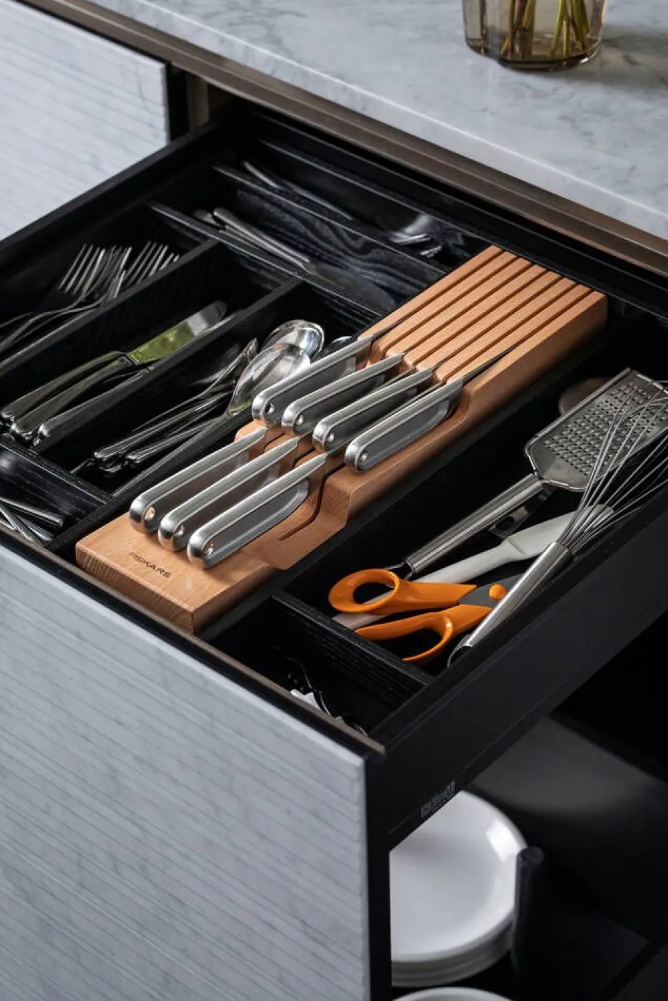 | Puinen Fiskars-veitsiteline sopii kolmelle isolle ja neljälle pienelle veitselle |
