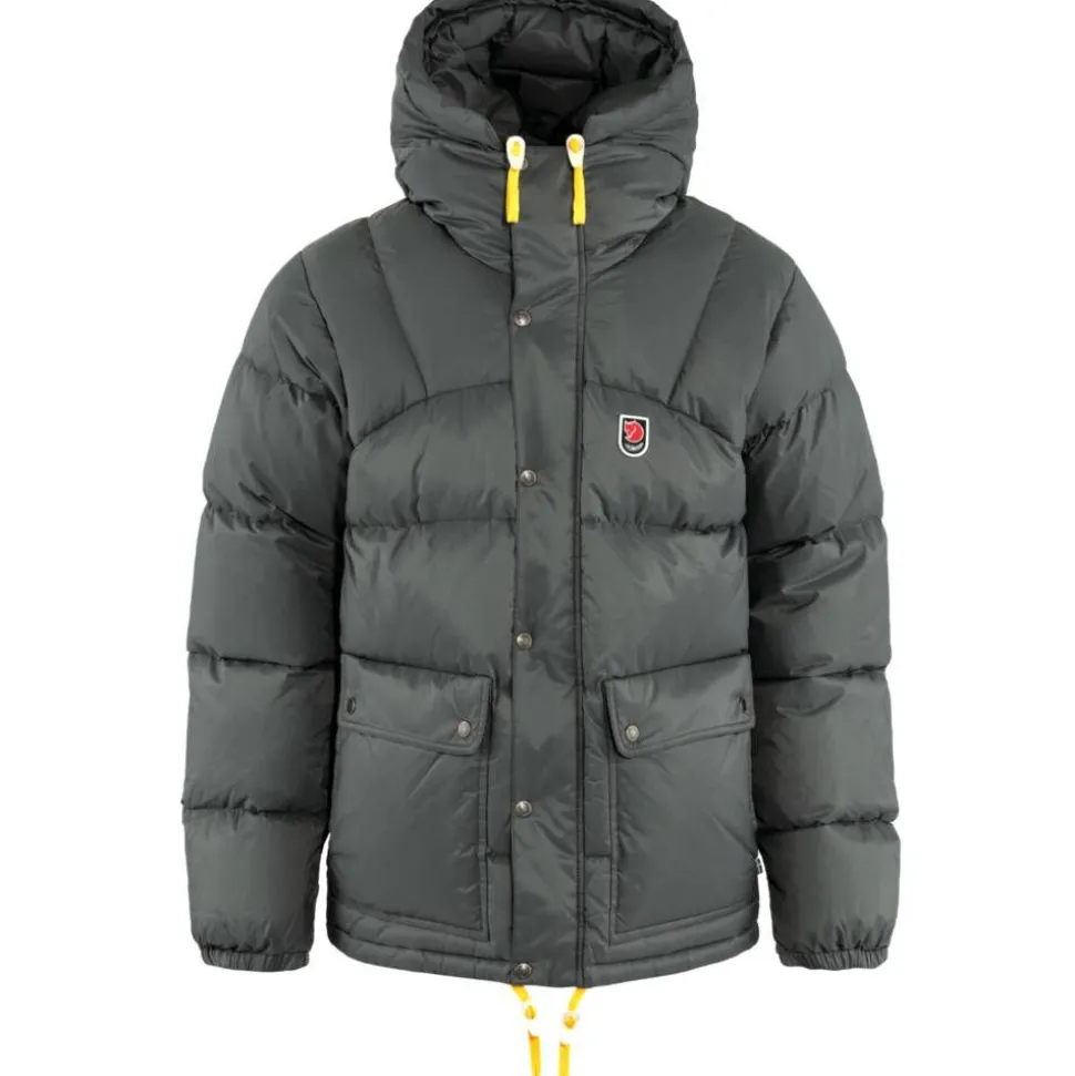 | Säädettävä huppu, jossa klassiset keltaiset kiristysnauhat ja nahkaiset yksityiskohdat. |