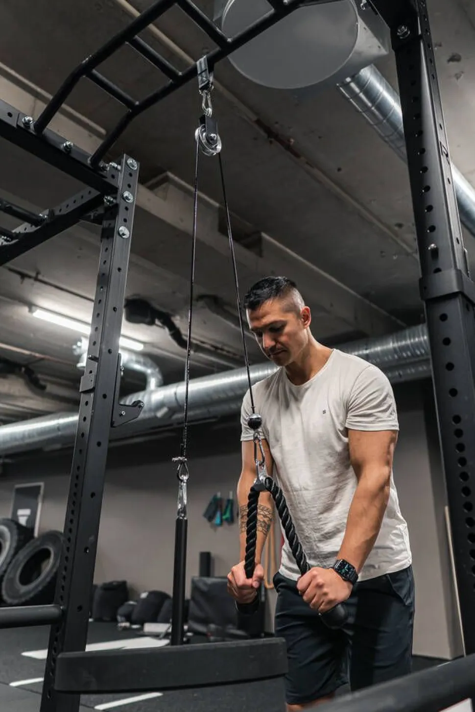 | Setti sisältää: Levypainopidike (korkeus 33 cm / sopii 30+ mm painoille). Taljavaijeri (pituus 200 cm / halkaisija 6 mm). Teräshihnapyörä (48 mm kiinnityshihnalla). 3 korkealaatuista teräshakaa. Ojentajaköysi (pituus 70 cm) |
