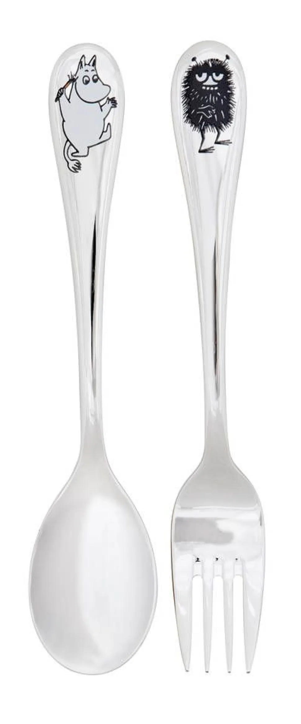 Ensilusikka ja -haarukka lapselle. Aterimien kuvituksissa Muumipeikko ja Haisuli. Ruostumatonta terästä.Muumit, byArabia Ensisetti Muumi ja Haisuli lusikka ja haarukka