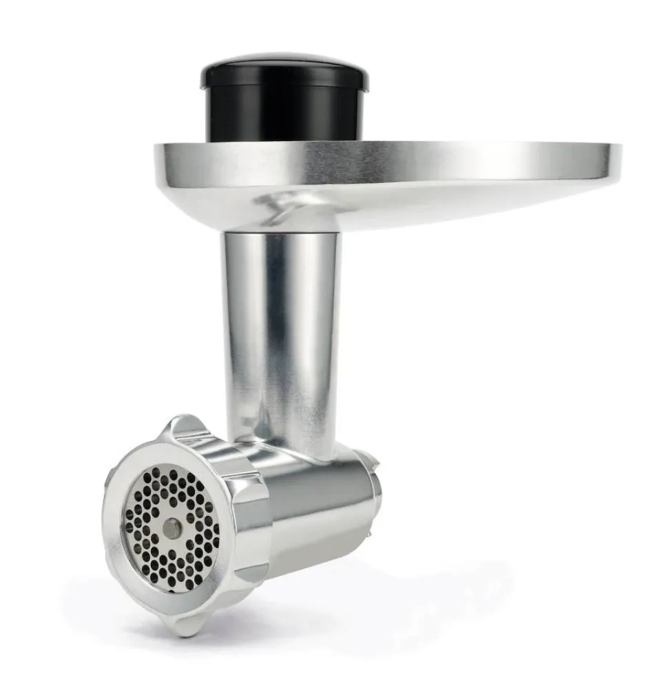 | Yhden myyntipakkauksen sisältö:Lihamyllyn mukana tulee kolme reikälevyä – normaali, keskikarkea ja karkea. Mukana pakkauksessa on myös kebbe- ja makkarasuppilot ohuemmalle ja paksummalle suolelle. |