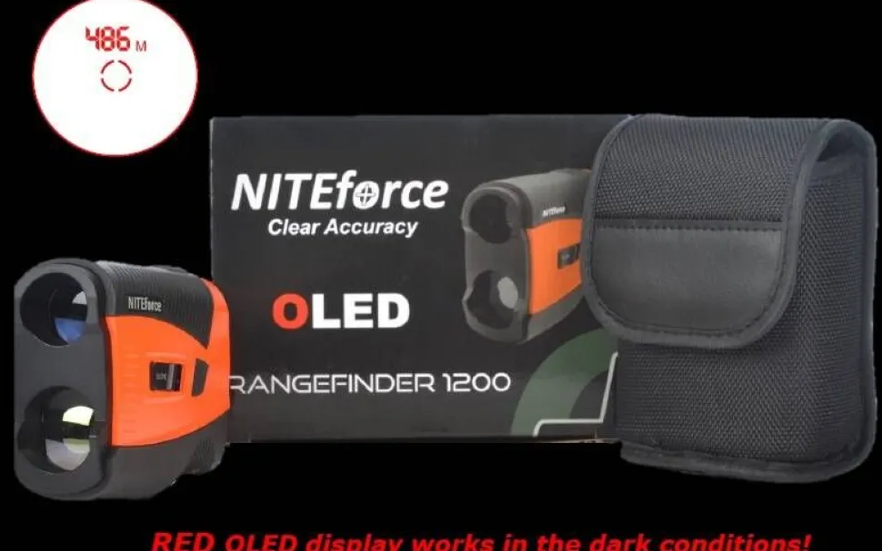 | NITEforce OLED Rangefinder 1200 kaikki linssit ovat hiotut ja pinnoitetut. Ne ehkäisevät naarmuuntumista sekä kosteutta. Laitteen toimintalämpötilat (0C° … +40C) soveltuvat hyvinkin haasteellisiin olosuhteisiin. Etäisyysmittarin musta kumisuojapinnoite antaa miellyttävän käsittelyominaisuuden sekä suojan vaativiin olosuhteisiin. Oranssi huomioväri näkyy ja erottuu hämärissä olosuhteissa tai repun pohjalta mustia laitteita paremmin. Näkyy myös maastossa mikäli mittari olisi vahingossa pudonnut maastoon. |