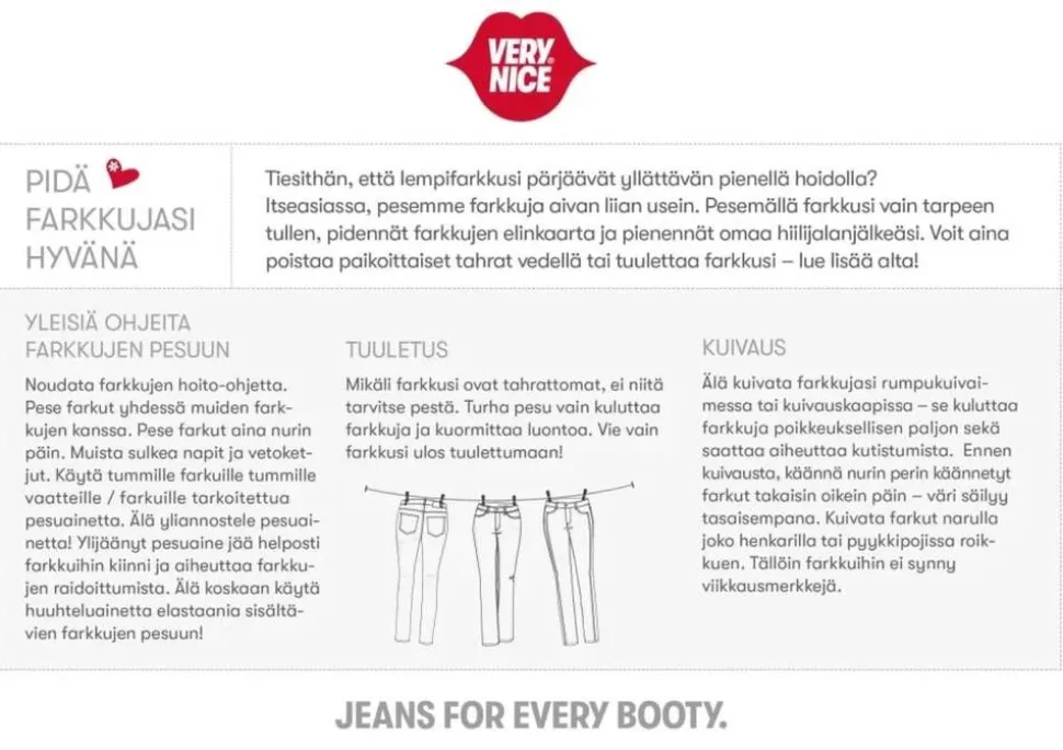 | Kaikki Very Nice farkut suunnitellaan Suomessa ja valmistetaan MASI Jeansin omalla tehtaalla Virossa. |