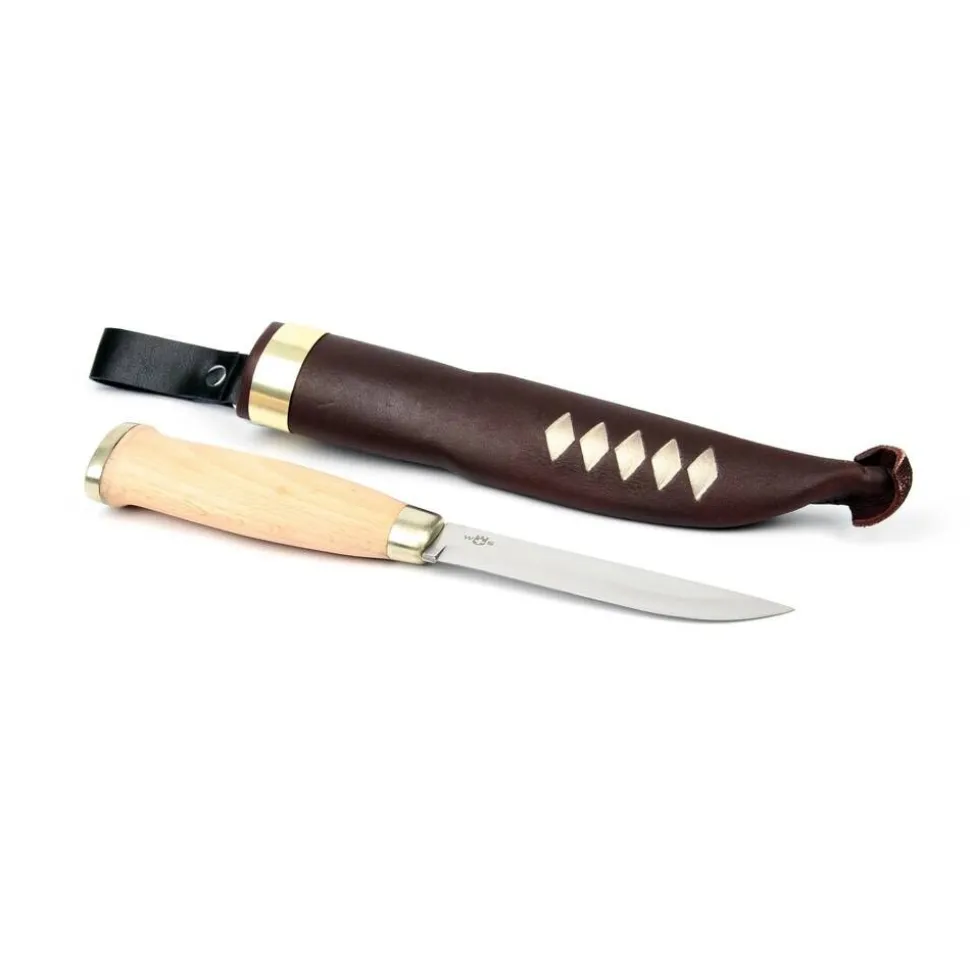 | Materiaali:Puinen kahva. Terä taottua saksalaista terästä. Tuppi aitoa nahkaa, sisällä muovinen suojus |