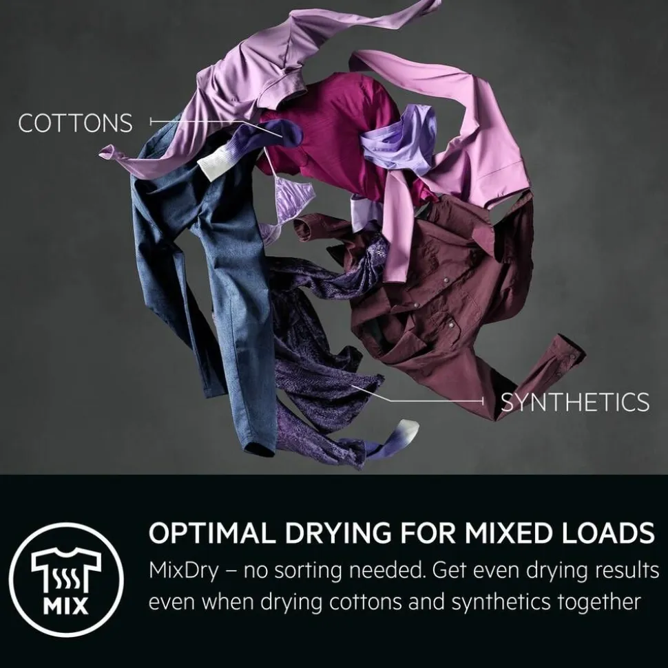 | MixDry kuivaa helposti ja tehokkaasti synteettiset ja puuvilla vaatteet tasaisesti. Ei lajittelua, lämpöpumpputekniikan avulla lämpö jakautuu tasaisesti vaatteiden kesken ja energiankulutus vähenee. |