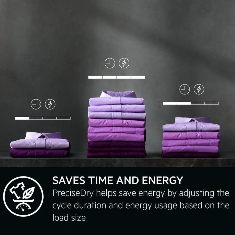 | PreciseDryn kosteusanturit optimoi kuivausohjelman pyykkimäärän mukaan, tämän ansiosta säästät aikaa ja energiaa. Vaatteet tuntuvat ja näyttävät paremmalta pidempään. |