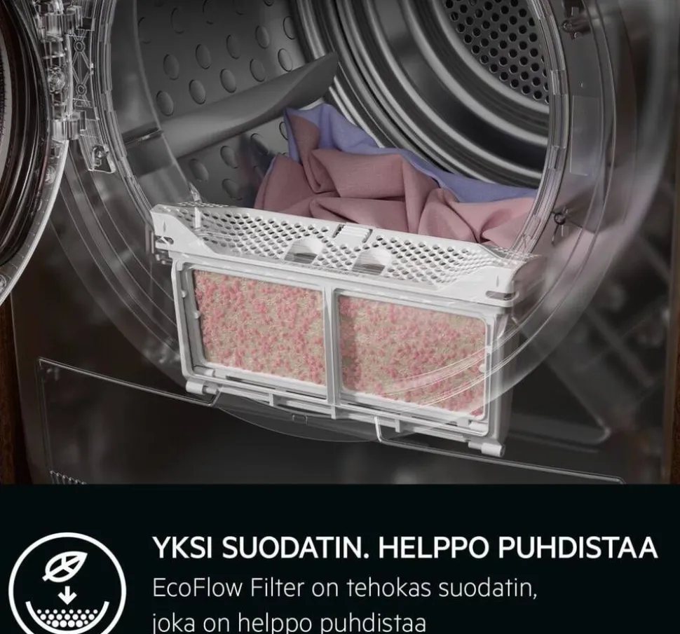 | Energiatehokkuus on kunnossa A++-luokan avulla, mutta myös EcoFlow-suodatin takaa, että energiaa säästyy puhdistamalla suodattimen helposti ja nopeasti. Näin kuivausrumpu toimii tehokkaasti koko elinkaarensa ajan. |