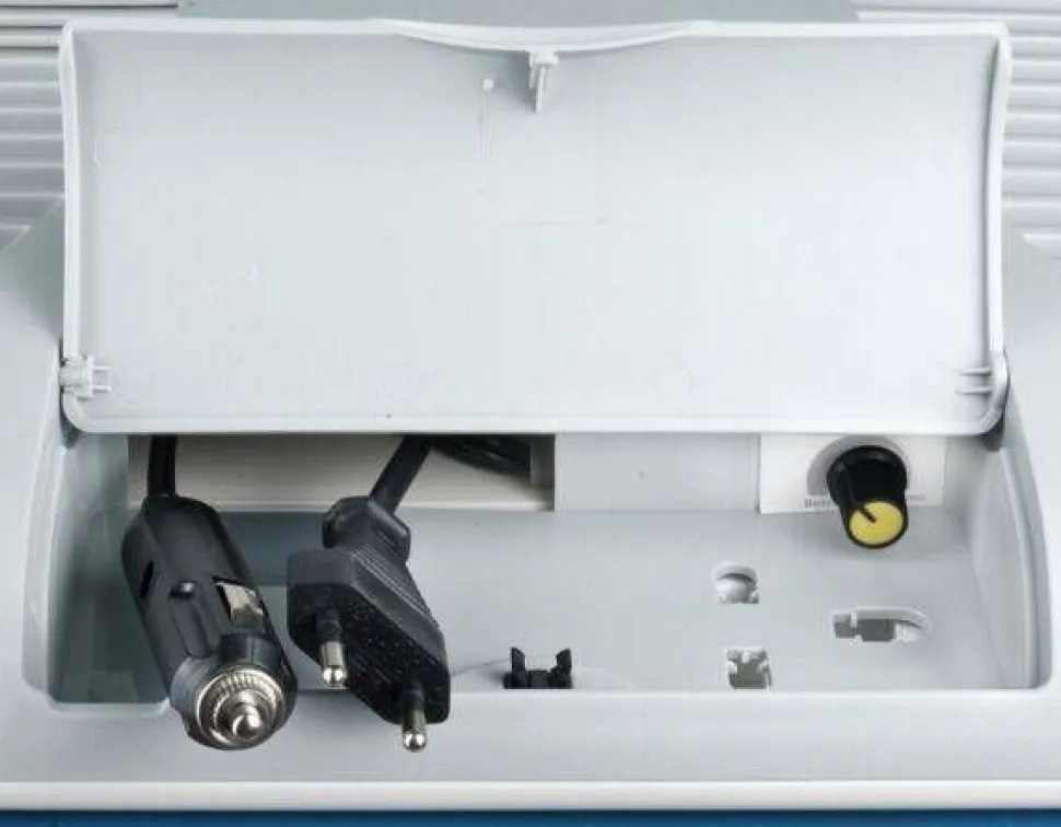 | Kiinteästi asennetut johdot DC/12 V ja AC/230 V tilavassa säilytyslokerossa. Pakkauksessa mukana varasulake 8 A autopistoketta varten. Pese sisäosa: nesteenpoistoa varten pohjassa on tulppa. |