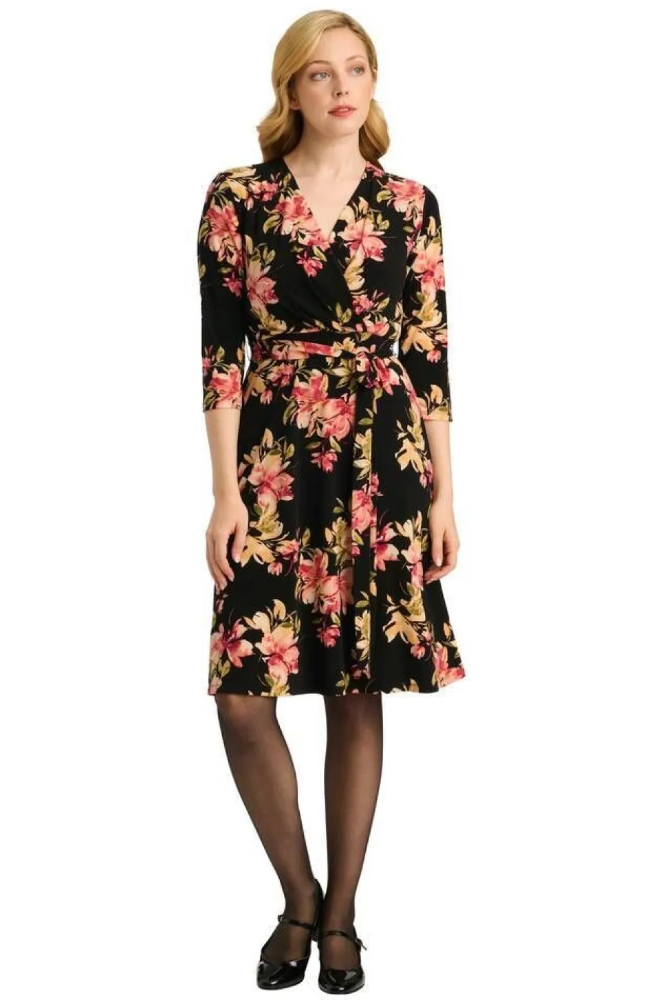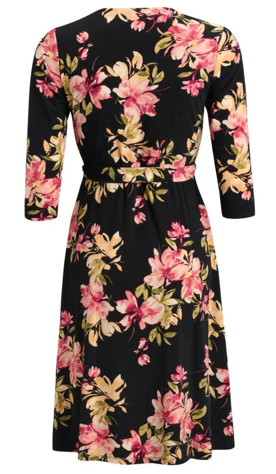 Naisellinen trikoomekko kauniilla kukkakuosilla. Mekossa on tyylikäs kietaisumallinen yläosa, 3/4-hihat, vyötärön kangasvyö, kellohelma, sekä joustava ohut vuorikangas.