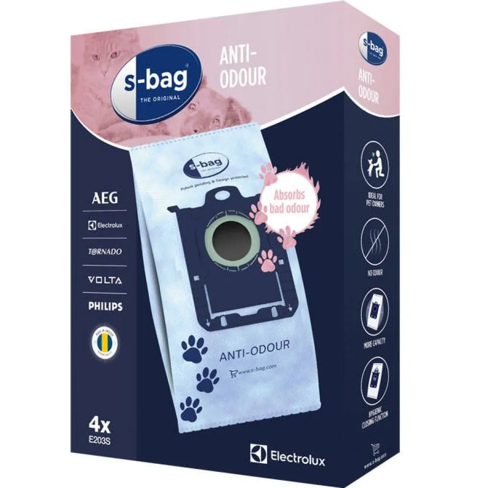 | Pakkaus sisältää 4 synteettistä s-bag® Anti-Odour -pölynimuripussia. |
