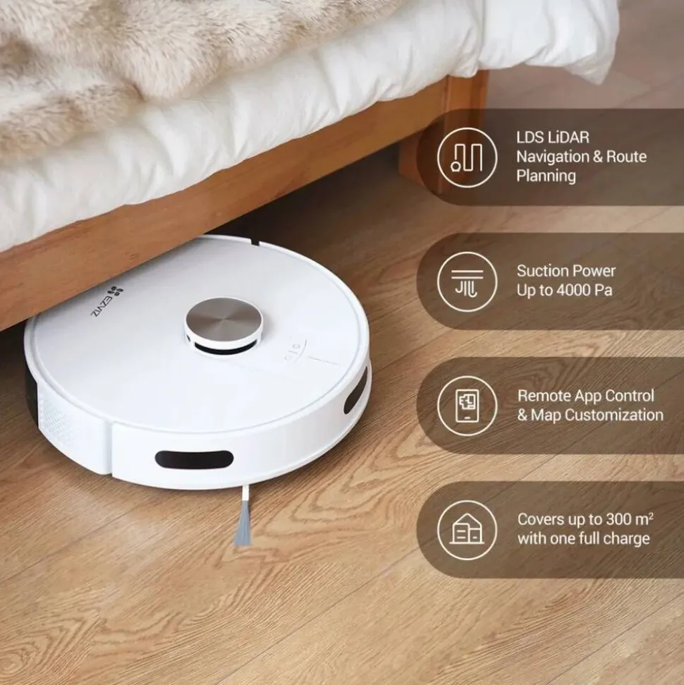 | Pakkauksen sisältö: RE4 robotti-pölynimuri, latausasema + virtalähde + tyhjennystelakka, sivuharjat 2 kpl, suodattimet 2 kpl, pölypussit 2 kpl, moppi, puhdistustyökalu, pikaohje suomeksi |