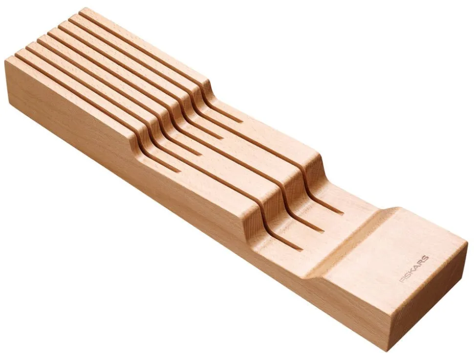 | Puinen Fiskars-veitsiteline sopii kolmelle isolle ja neljälle pienelle veitselle |