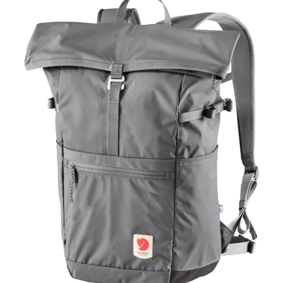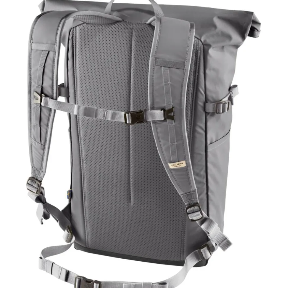 | Yläosassa taiteltava sulkumekanismi vetoketjulla ja metallisoljella. |