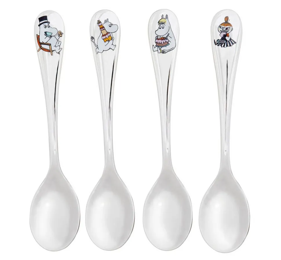 Muumiaterimet, kahvilusikkasetti Juhlahetki. 4 eri hahmoa juhlatunnelmissa: Muumipappa, Muumipeikko, Niiskuneiti ja Pikku Myy. 4 kpl lusikoita, joiden pituus on 13,4 cm. Ruostumatonta terästä.Muumit, byArabia kahvilusikkasetti Juhlahetki 4 kpl. lusikoita.