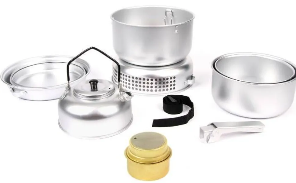 | Sarja sisältää: Sprii keitin, keittimen runko, tuulisuoja, 2 x kattila, 2 x paistinpannu, kahvipannu, pihdit |