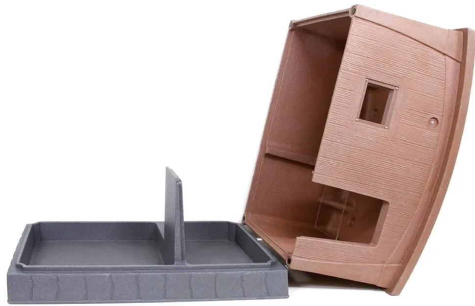 | Mitat:Leveys 102 cm, pituus 156 cm, korkeus 94 cm. Välioven leveys 32 cm, korkeus 46 cm, välioven kynnys 15 cm. Sisätilojen mitat (noin) leveys * pituus * korkeus -Tuulikaappi: 47cm * 78cm * 77cm – Koppiosa: 82cm * 78cm * 77cm. Oviaukon mitat: leveys alhaalta: 31 cm, ylhäältä 27 cm, korkeus 43 cm. |
