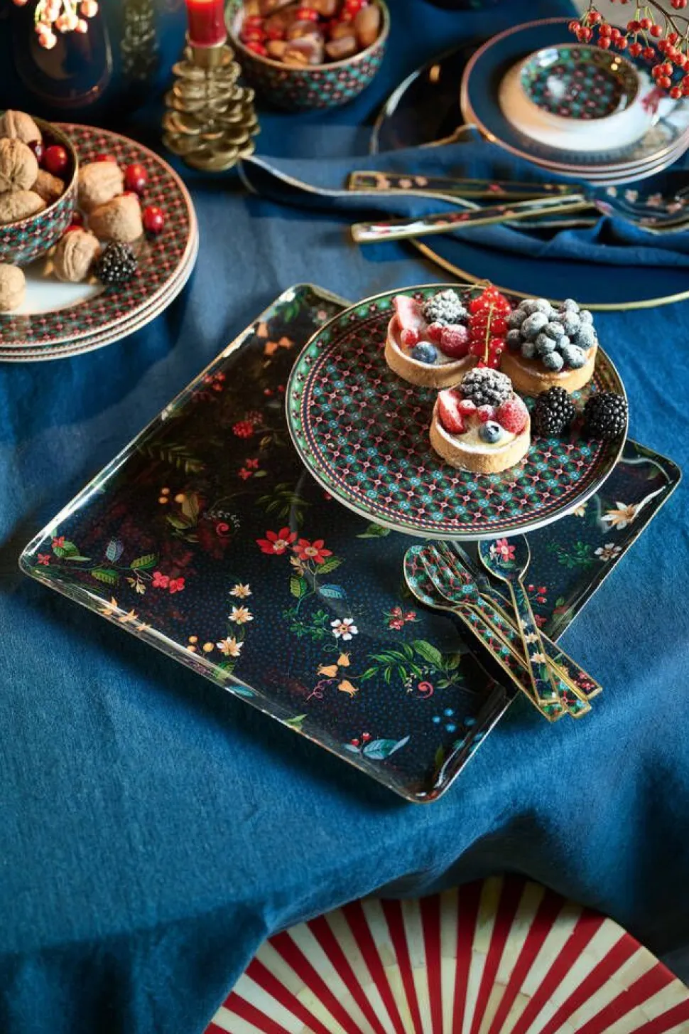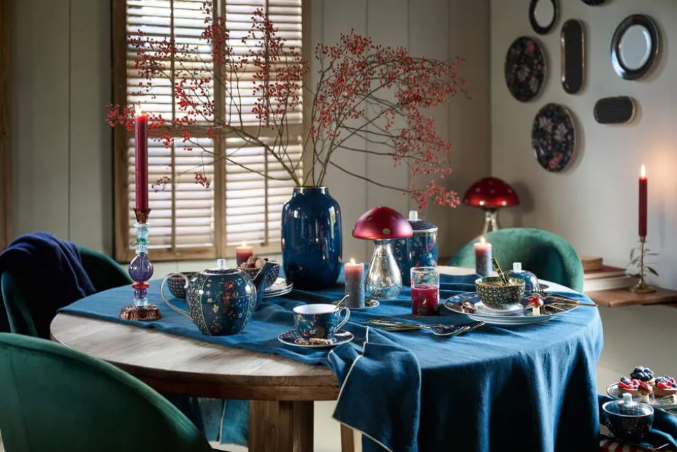 | Pip odottaa jo salaa pitkiä talvi-iltoja. Sellaisina iltoina hän kutsuu perheen ja ystävät illalliselle. Tätä tarkoitusta varten Pip suunnitteli Berry Blues -kokoelman. Tämän kokoelman tuotteissa on tummansininen kukkakuvio, jossa on oksia, joilla kasvaa elegantteja fantasian kukkia ja marjoja. Kukkakuvio yhdistyy syvään vihreään ruutukuvioon, jossa on punaisia aksentteja, jotka muistuttavat näistä tunnetuista talviruuduista. Reunat on viimeistelty kultaisilla yksityiskohdilla ja yllättävällä punavalkoisella raidalla, joka antaa kokoelmalle lämpimän ja kodikkaan tunnelman. Voimme sanoa, että Berry Blues -kokoelmamme on paras lääke talvibluesia vastaan. Tämä tuote ei sovellu astianpesukoneeseen, uuniin tai mikroaaltouuniin. |