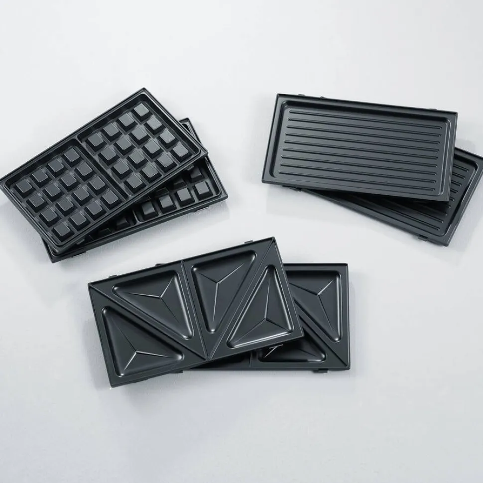 | 3 eri paistolevyä: voileipä-, parila- ja vohvelilevyt |
