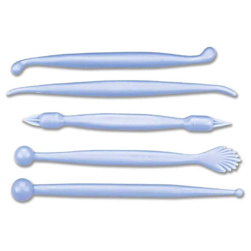 Muotoiluvälineet esimerkiksi sokerimassasta tai marsipaanista valmistettaessa koristeita ja hahmoja. 5 erilaista välinettä.