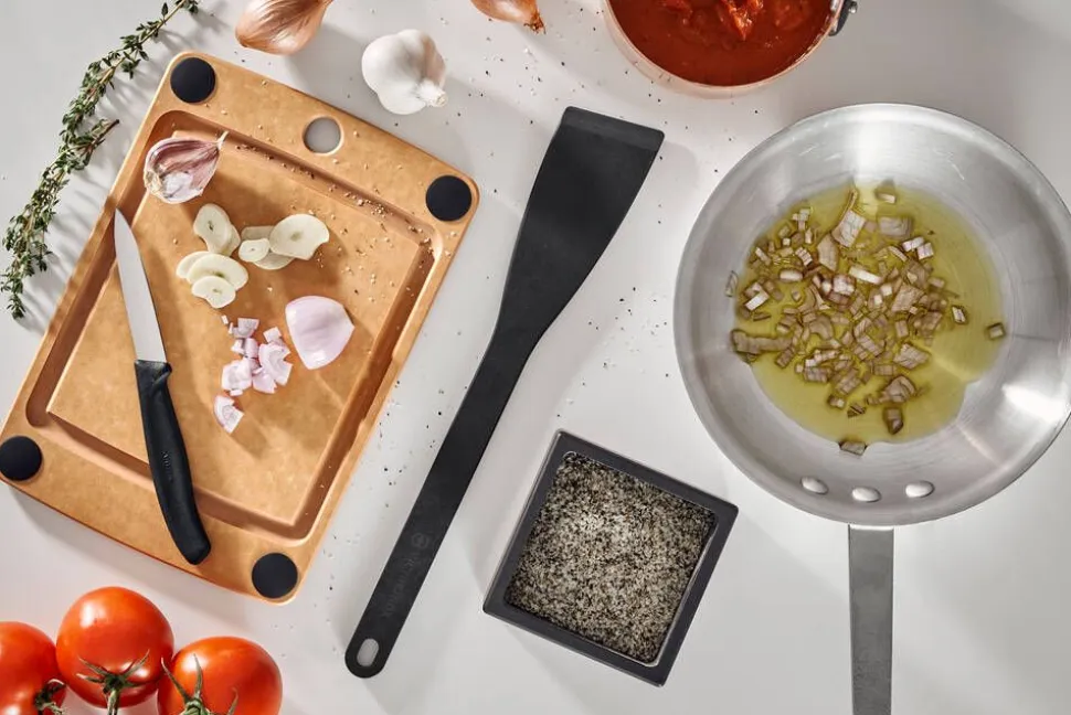 Victorinoxin Kitchen -leikkuulauta on valmistettu astianpesukoneen kestävästä, ympäristöystävällisestä paperikomposiittimateriaalista, joka luontaisen kimmoisuutensa (””natural bounce””) ansiosta on erittäin hellä veitsen terälle. Leikkuulauta kestää 175 °C:n kuumuuden, joten sitä voi käyttää myös pannunalusena. Ulkoreunaa kiertävä ura kerää esim. lihojen ja hedelmien käsittelyssä syntyvät nesteet, ja myös kulmien liukuesteet sekä ripustusreikä lisäävät leikkuulaudan käytännöllisyyttä. Materiaali koostuu paperiarkeista, jotka prässätään yhteen tasaisen lämmön ja paineen avulla. Lopputuloksena on vankka, tasapainoinen ja kestävä materiaali. Tuotteet valmistetaan Epicureanin tehtaalla Wisconsinissa USA:ssa. Kaikki tuotantoprosessin aikana syntyvä jäte ja ylijäämämateriaali pyritään minimoimaan, käyttämään uudelleen tai kierrättämään aina kun mahdollista. Myös lämpö otetaan talteen, ja käytetään varastotilojen lämmittämiseen talvella.